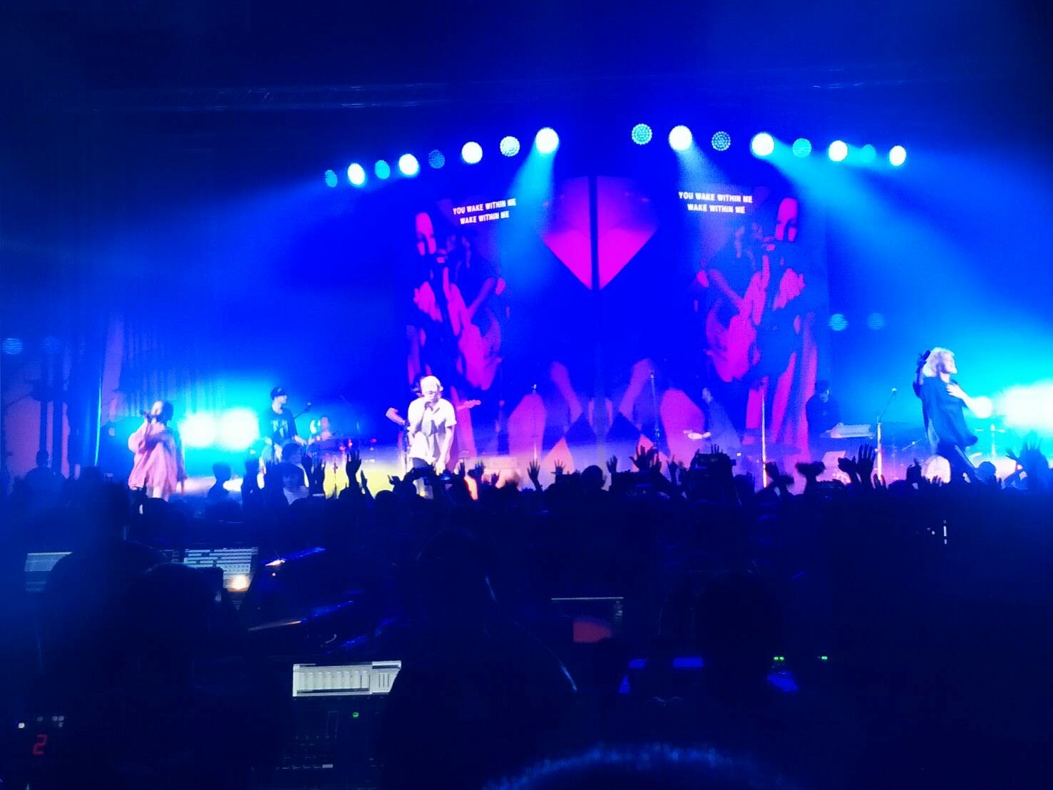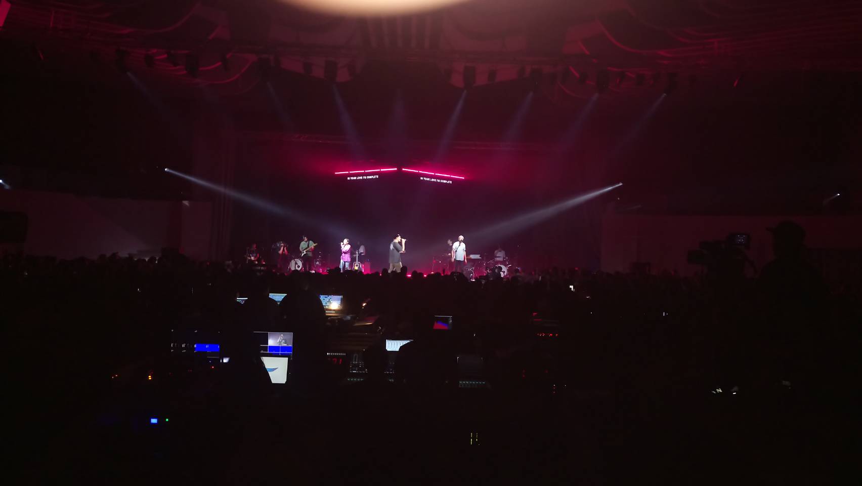 入場時,能容納多人的美河堂,站立區和座位區已黑壓壓擠滿人!排成X形狀的黑色舞台,表達出此次演出「聯合敬拜」的含意,全黑的前導效果,仿佛無光的世界。會眾專注等待,然後Hillsong來了!又是那樣熱烈、溫暖的歌聲,30組舞台燈,打出像翅膀一樣簡潔但富有意涵的光束,音響傳達出吉他的渾厚,令人彷彿置臨巨大而空曠的場域,那是充滿震撼和感染力的音樂氛圍,令人屏息和莊重!後面座位區的聽眾,也不由站立、並舉起手來─是的,我們,要一起來敬拜神!