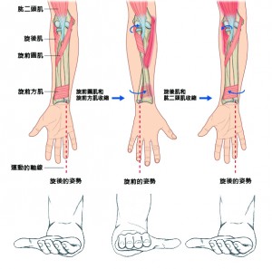 上肢的前臂部分是由兩塊長形骨骼構成:內側的尺骨和外側的橈骨。這兩塊骨頭在靠近肘部和腕部的這兩端,會靠在一起形成關節,稱之為橈尺關節。由於關節接合面的特殊結構,使得橈尺關節可以做出使前臂旋轉的動作(圖一)。如果我們將前臂水平前伸、掌面朝上,此時尺骨與橈骨是並排在內側與外側的位置上;接著,我們若將手掌向內轉至朝下的姿勢,外側的橈骨會向內旋轉從上方跨過尺骨到內側,使得兩根骨頭呈現交叉的樣子,這個動作稱為旋前,一種右手向逆時針方向轉動的動作。我們若從掌面向下、旋前的動作,將前臂向外轉動使掌面回到向上的姿勢,此時尺骨與橈骨回到並排的位置上,這個動作則稱為旋後,對右手而言,這是一個向順時針方向轉動的動作。
