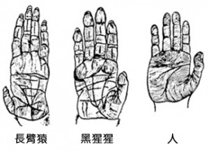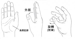 除了前臂的旋轉外,「開」和「關」還需要用到手的抓握動作。手部的抓握動作是指五根手指向掌心移動,呈現碗狀的姿勢,其中最特殊的就屬拇指的運動(圖二)。在拇指基部的掌面有一群肥厚的肌群,稱為魚際肌群(「魚際」在拉丁文的原意是指「魚的腹部」,是不是很像呢?)由於這群肌肉的作用,使得拇指可以做出向前(外展)和旋轉向掌心(對掌)的動作,再加上其他四根手指的屈曲動作和手掌小肌肉的收縮,讓手心凹陷成一個球窩的形狀,方便作有效的抓握。這種動作可是專屬於我們的喔!相較於長臂猿或黑猩猩,它們的手形較長,雖然可以抓取東西,如抓著樹枝在空中盪來盪去,但卻不能有效的握物,這是因為它們手掌無法做出碗形的動作(圖三)。
