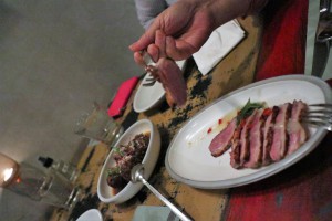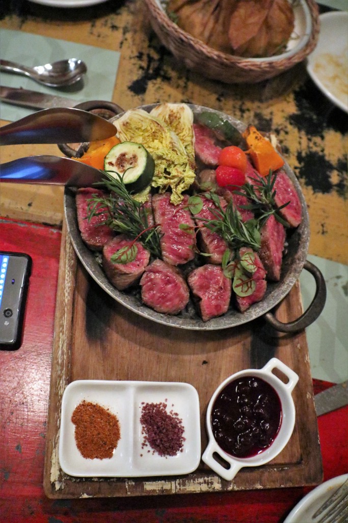 食材頂級的牛小排,在鹽盤上,鹽烤至五分熟。當牛小排呈現粉紅色,是口感最佳時機。佐以藍莓醬、紅酒鹽、香辣粉,