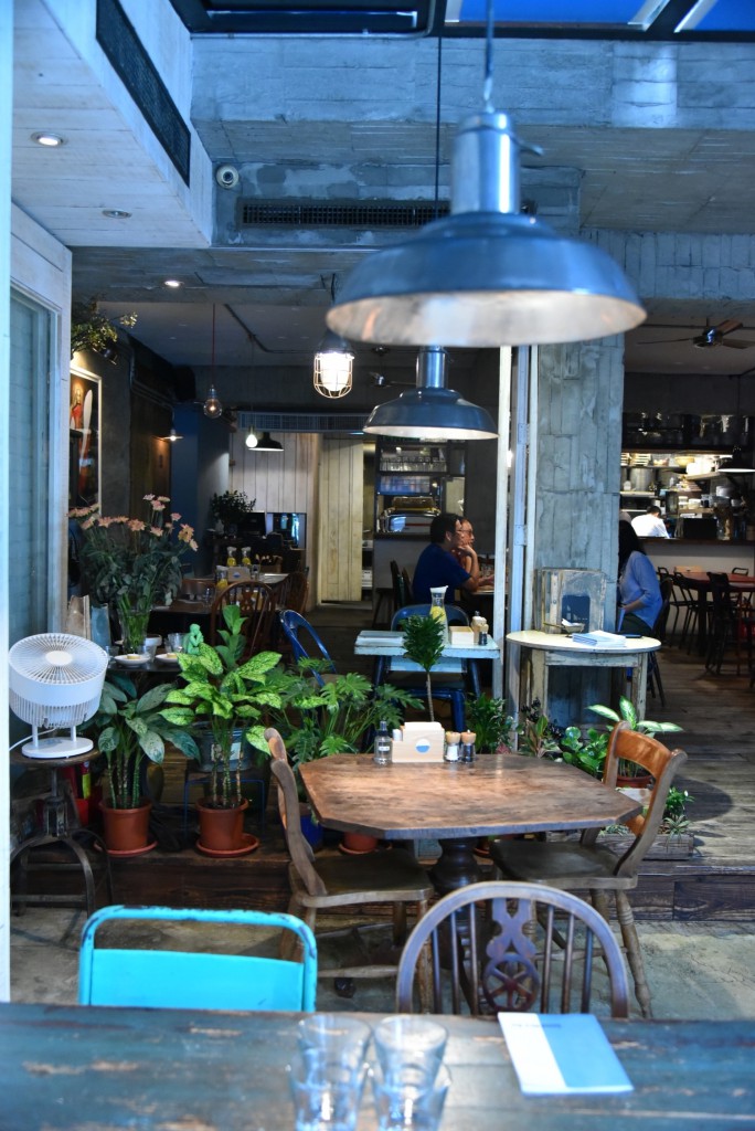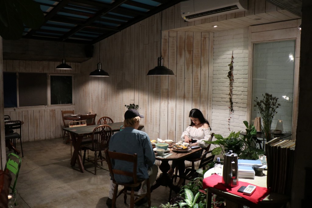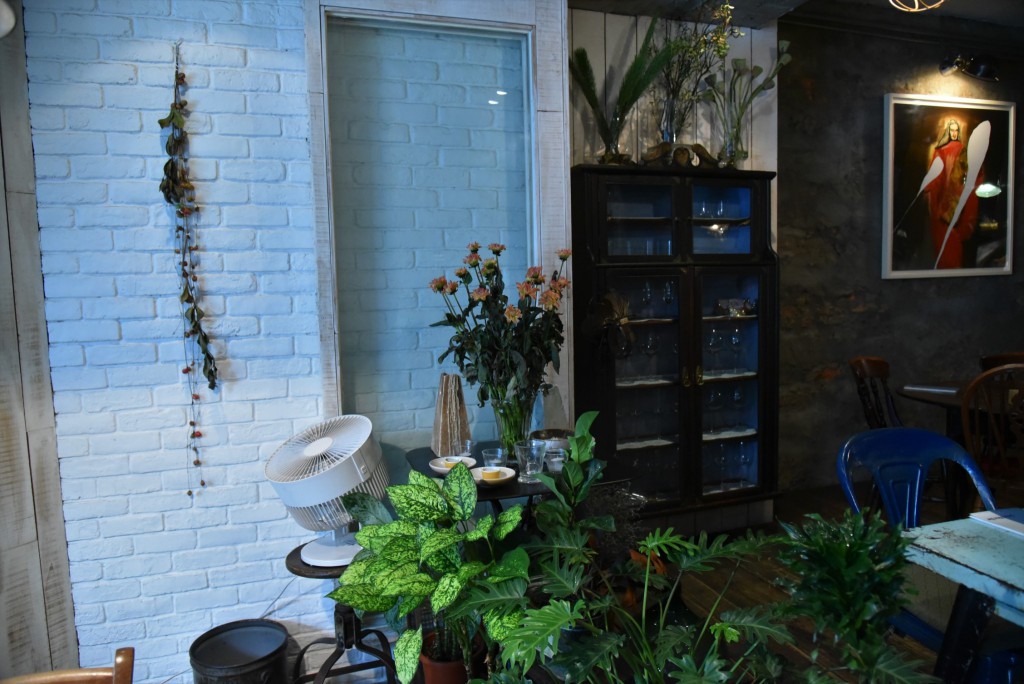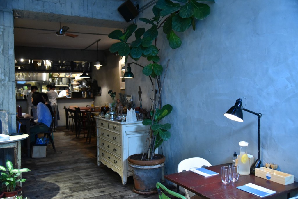 手繪的Menu;白色做舊木條拚貼的牆板;舊桌椅與植栽、乾花的黯淡、靜謐;灰綠色的牆壁;擺飾、裝盤;輕柔的音樂;即便白天,也顯得幽暗的空間,那種隨性自然,能讓心,瞬間沉靜!