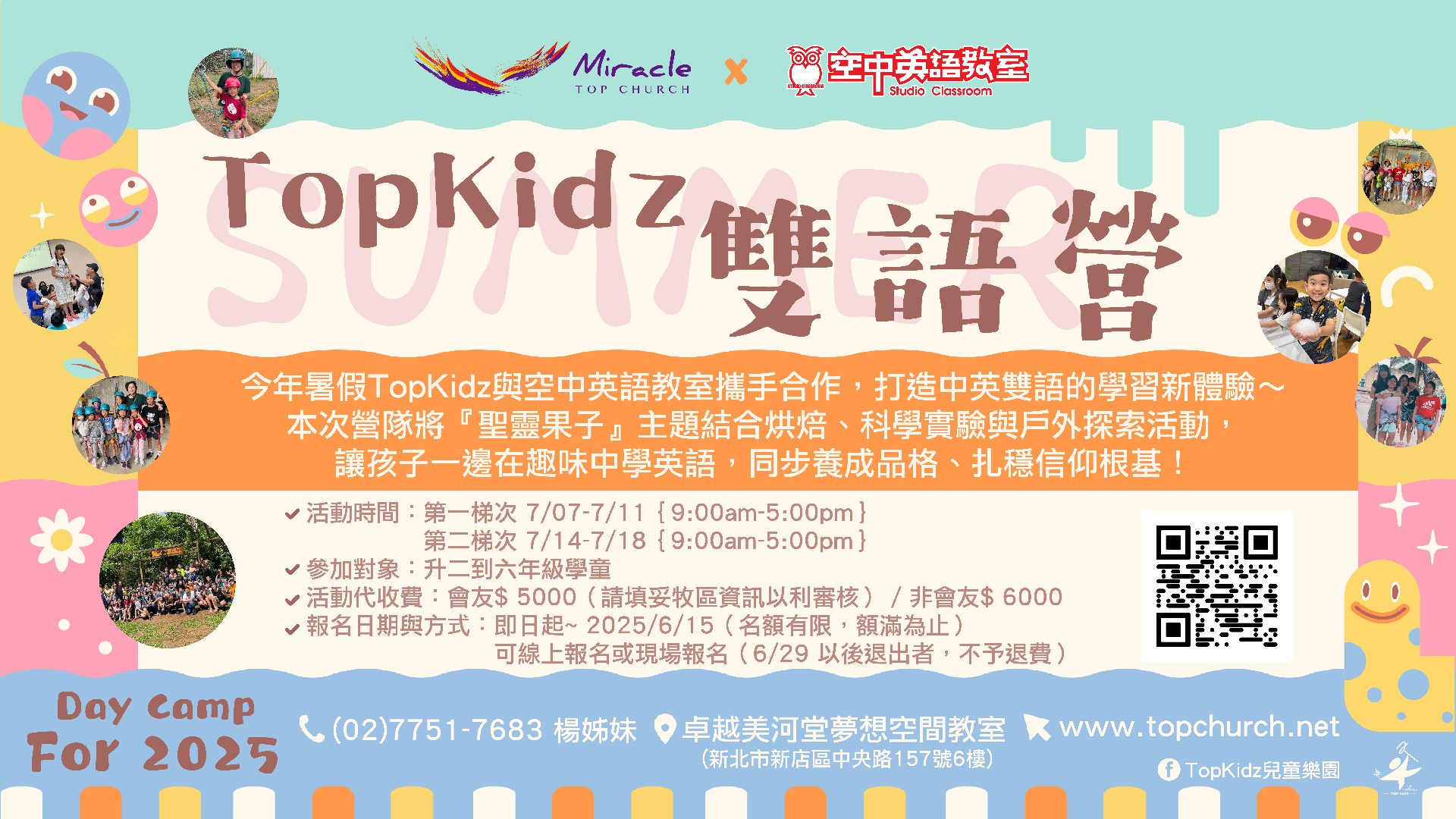 今年暑假TopKidz與空中英語教室攜手合作,打造中英雙語的學習新體驗~本次營隊將〖聖靈果子〗主題結合烘焙、科學實驗與戶外探索活動,讓孩子一邊在趣味中學英語,同步養成品格、扎穩信仰根基!