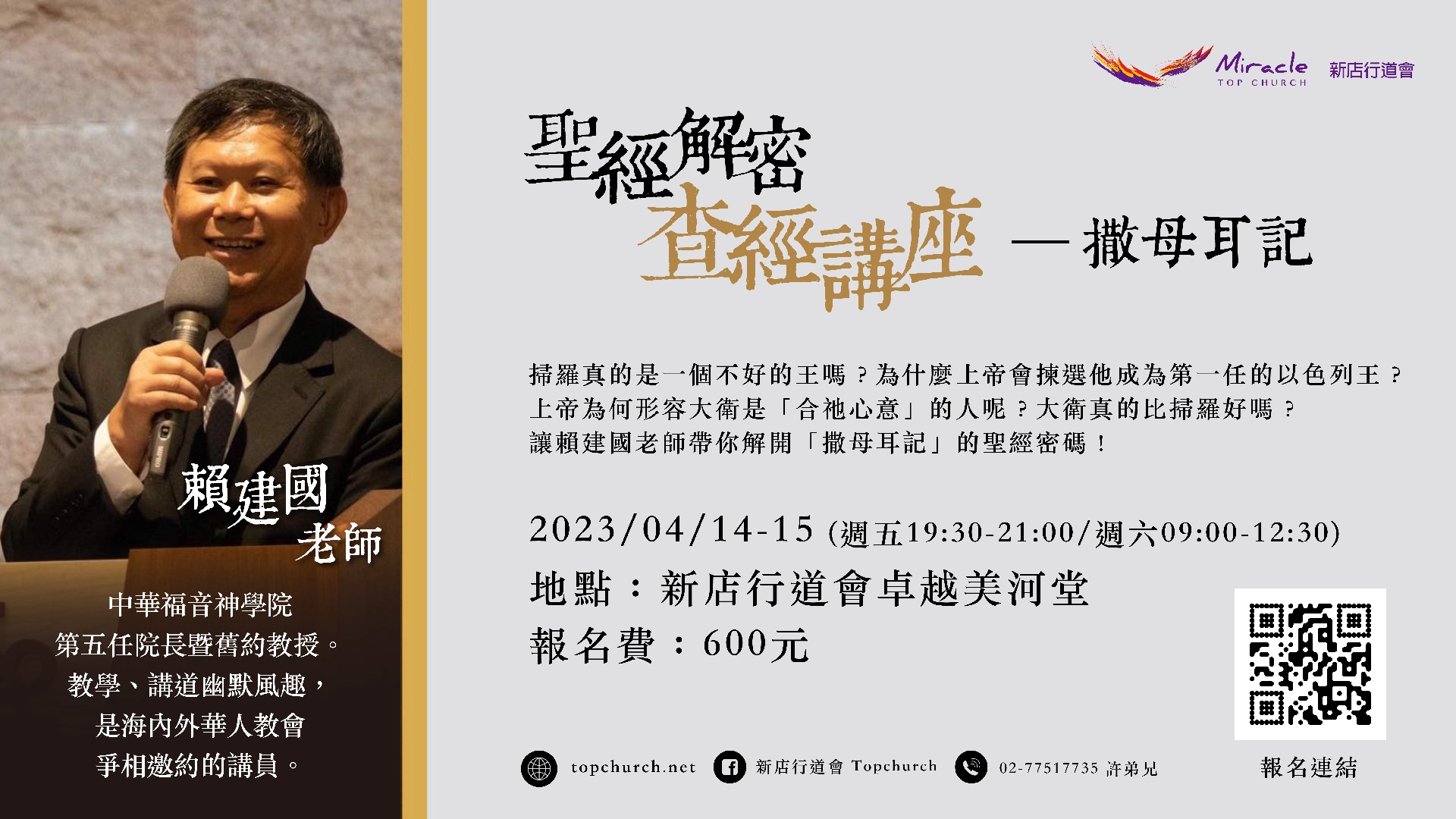 *查經講座資訊 日期:2023/04/14-15 (週五19:30-21:00/週六09:00-12:30) 地點:卓越美河堂 報名費:600元