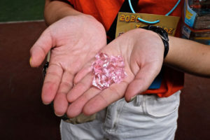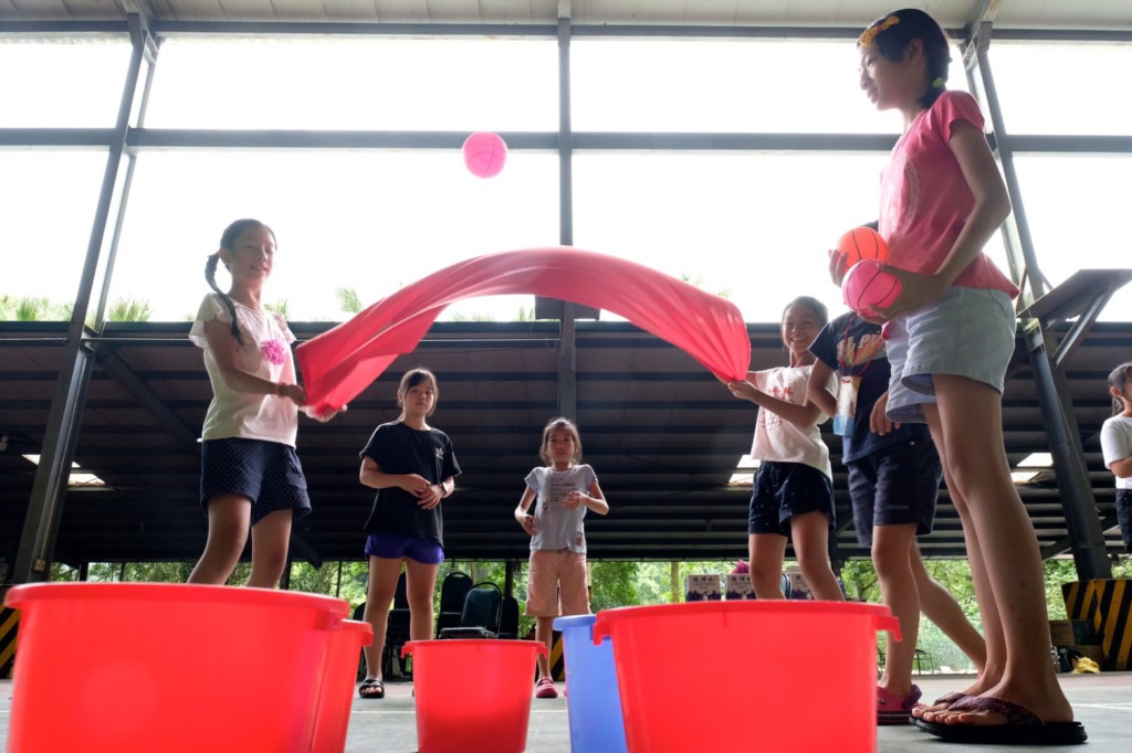 「同心協力」,是兩位隊員搖繩,其他隊員端著裝滿水的水杯跳繩完成任務,要將杯中的水,更多地保存下來!